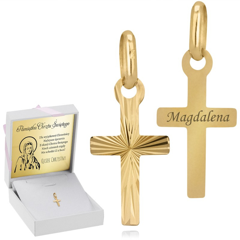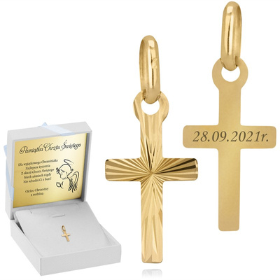 Złoty mały krzyżyk z łańcuszkiem / pr. 585 / na I Komunię Św., Chrzest Św. / różowa kokardka / z Grawerem i Dedykacją
