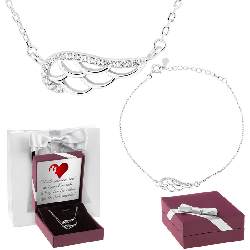 Srebrny komplet naszyjnik + bransoletka skrzydło z cyrkoniami Dedykacja