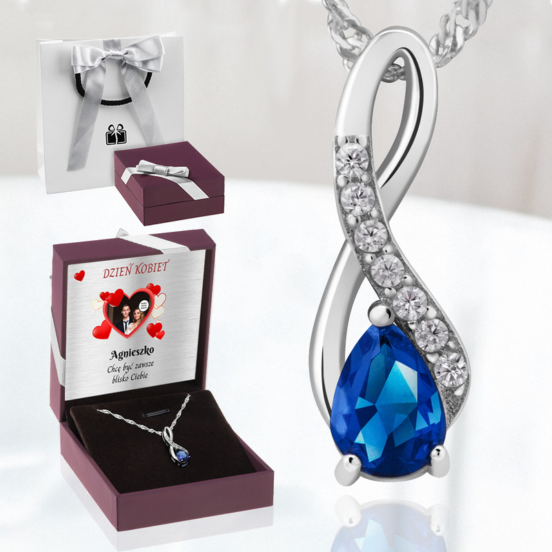 Naszyjnik nieskończoność pr. 925 z niebieską cyrkonią i dedykacją