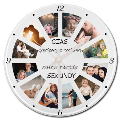 Zegar ścienny ze szkła na 12 zdjęć z personalizacją dla rodziny