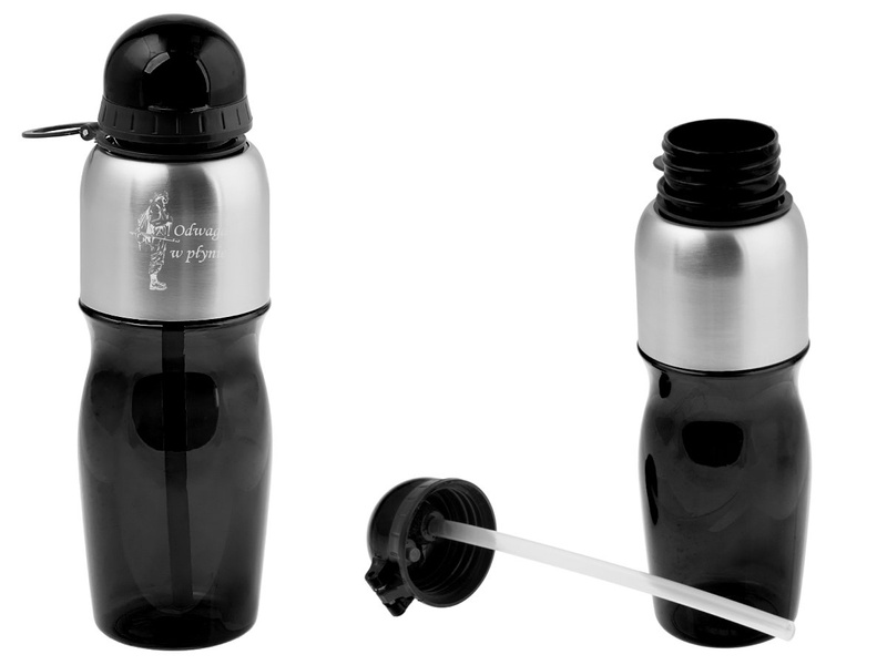 Czarny bidon sportowy z grawerem laserowym na stalowej części