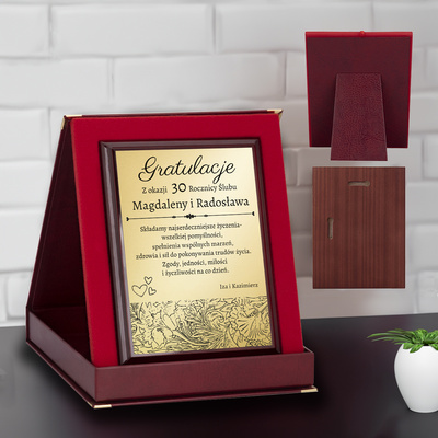 Prezent na rocznicę ślubu / Drewniany panel, złota tabliczka, etui, dedykacja