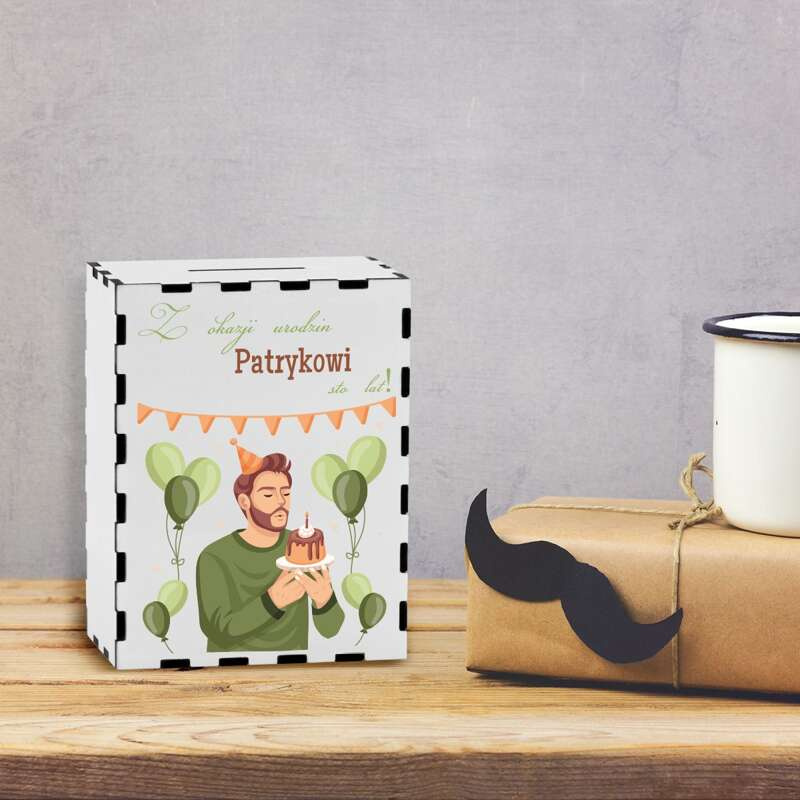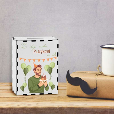 Drewniana skarbonka na urodziny / Prezent dla niego / Kolorowy Nadruk