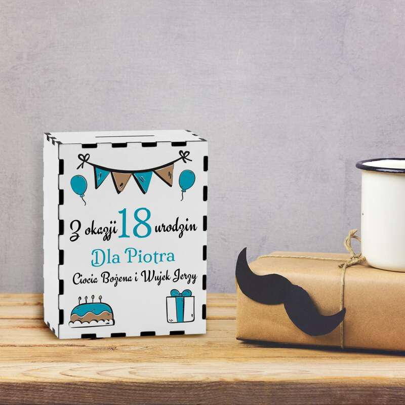 Drewniana skarbonka na urodziny / Prezent na 18 dla niego / Kolorowy Nadruk