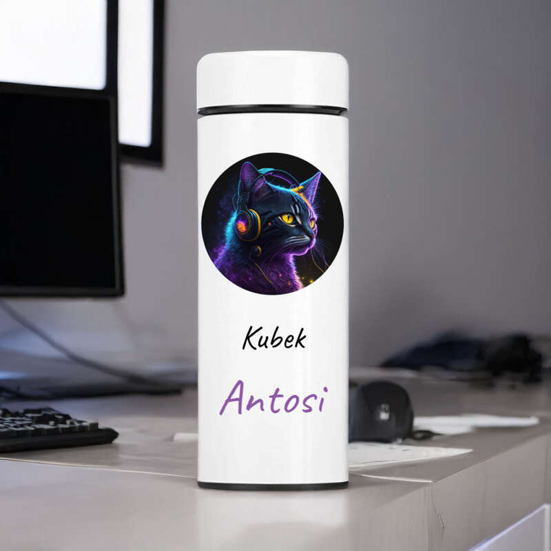 Na Święta kubek termiczny LED z nadrukiem UV Kot w słuchawkach