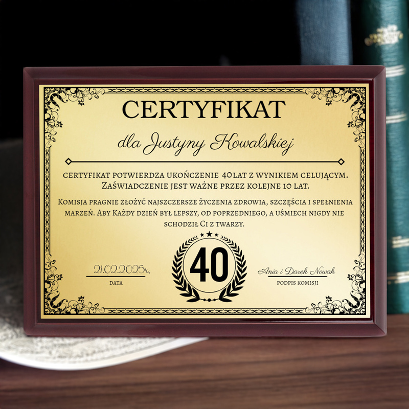 Dyplom na urodziny / Drewniany panel, złota tabliczka, dedykacja / Prezent na urodziny