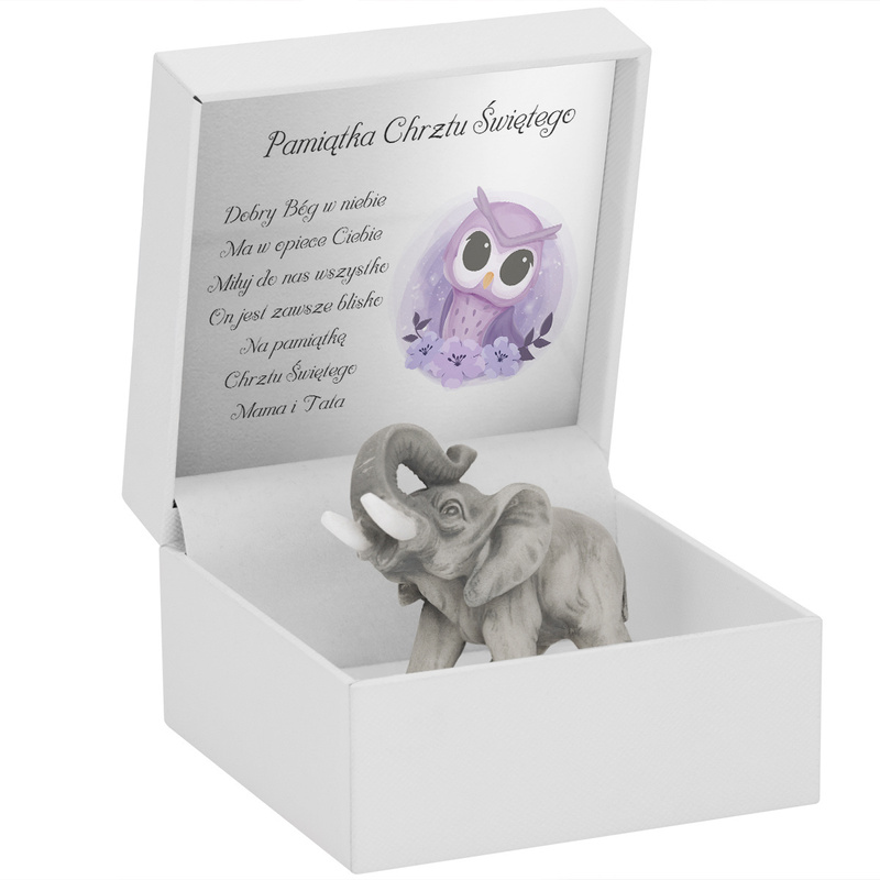 Słoń z alabastru na chrzest / Pudełko z dedykacją / Torebka