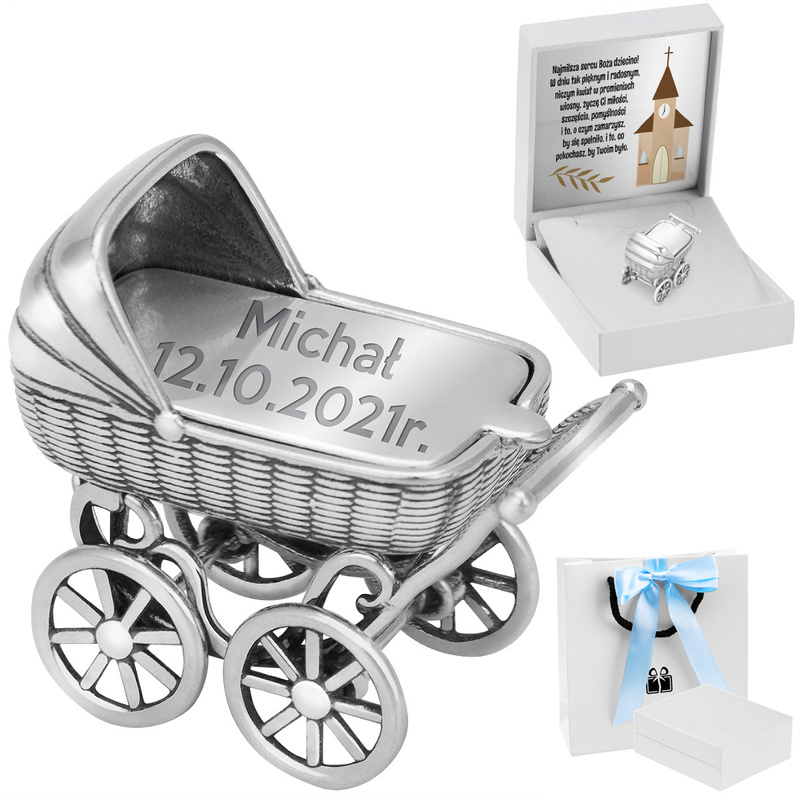 Srebrny wózek / pamiątka prezent na Chrzest / różowa kokardka / pr. 925 / z Grawerem i Dedykacją