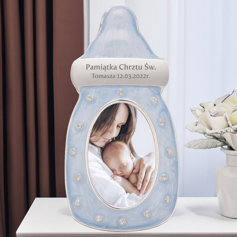 Ramka na zdjęcie Błękitna Butelka / Pamiątka chrztu z grawerunkiem.