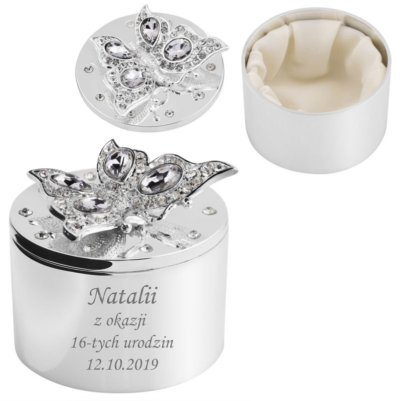 Posrebrzana szkatułka z motylkiem prezent z Grawerem na chrzest roczek