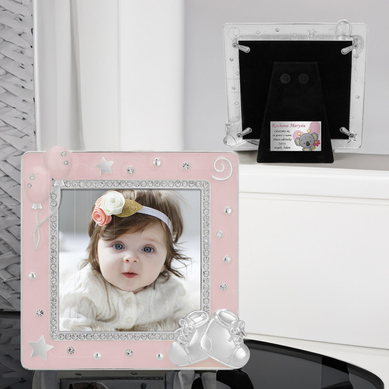 Różowa ramka na zdjęcie z cyrkoniami / Prezent na chrzest z dedykacją.