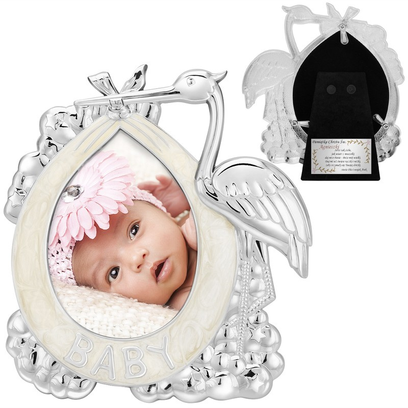 Ramka na zdjęcie Beżowy Bocian / Pamiątka chrztu z grawerem.