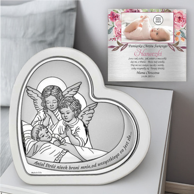 Pamiątka Chrztu: obrazek serce Anioł Stróż na białym panelu z dedykacją