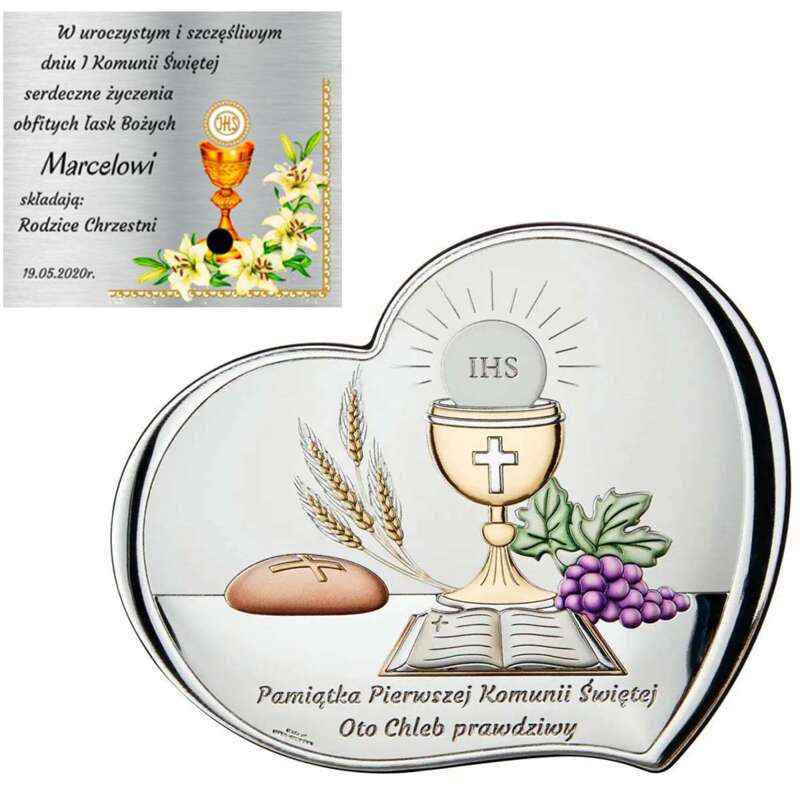 Obrazek serce z Hostią na I Komunię – srebrny z grawerem