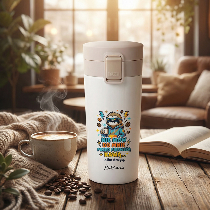 Personalizowany kubek termiczny Leniwiec – „Nie mów do mnie przed pierwszą kawą” 350 ml