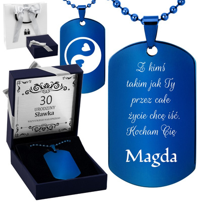 Nieśmiertelnik niebieski stal szlachetna z grawerem i dedykacją