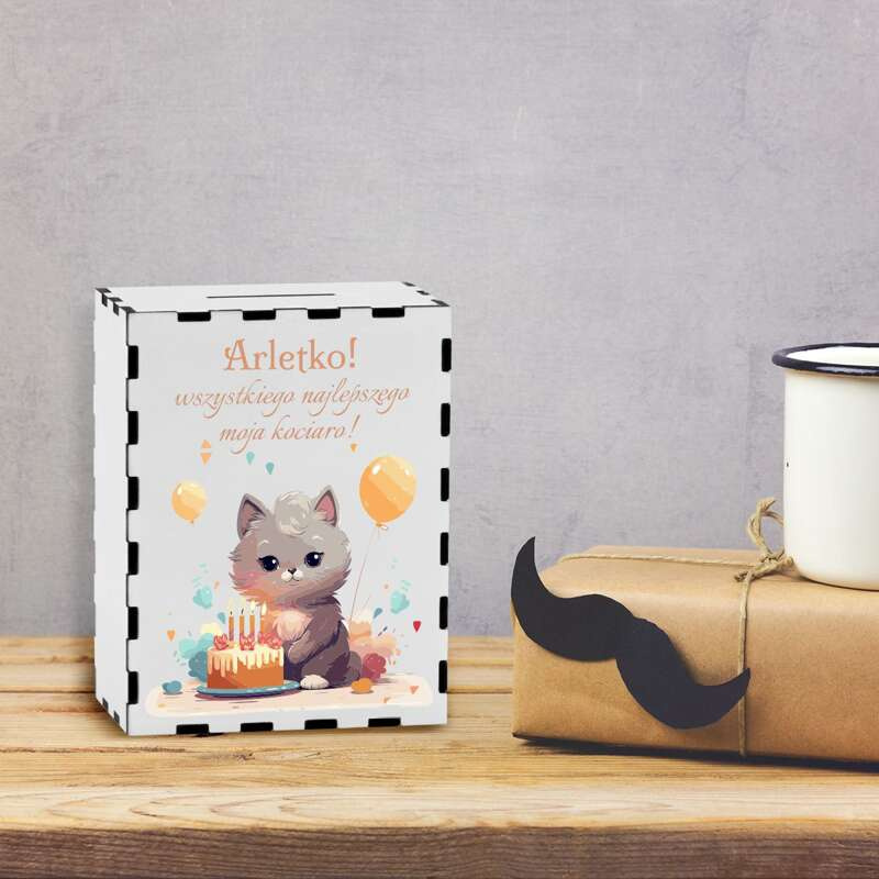 Drewniana skarbonka na urodziny dla Kociary / Prezent na urodziny / Kolorowy Nadruk