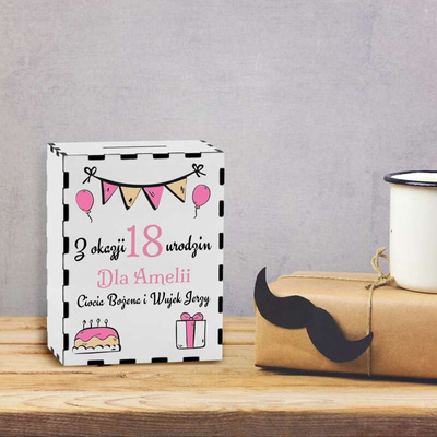 Drewniana skarbonka na urodziny / Prezent na osiemnastkę dla niej / Kolorowy Nadruk