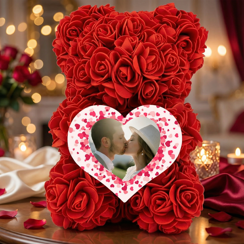 Miś z czerwonych róż z personalizowanym sercem – romantyczny prezent z Twoim zdjęciem