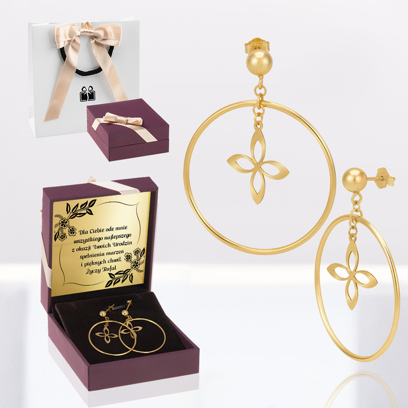 Pozłacane kolczyki koła z kwiatkiem i dedykacją w pudełku - srebro 925 / prezent na Walentynki, Dzień Kobiet, rocznicę
