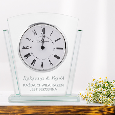 Szklany zegar stołowy z grawerem – elegancki prezent ślubny i rocznicowy