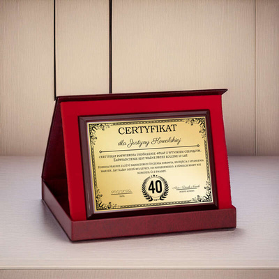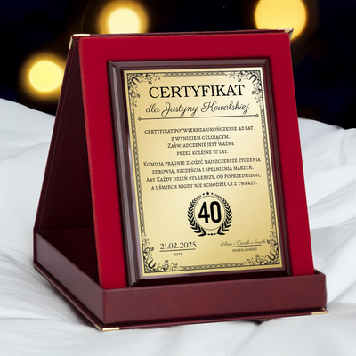 Dyplom na urodziny / Drewniany panel, złota tabliczka, etui, dedykacja / Prezent na urodziny