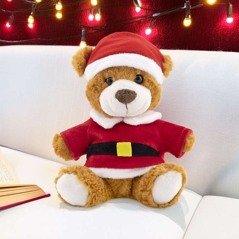 Pluszowy miś w stroju Świętego Mikołaja na Mikołajki i Święta