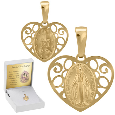 Złoty medalik oprawiony w ażurowe serduszko pr.585 / Z dedykacją / W pudełku z różową kokardką.