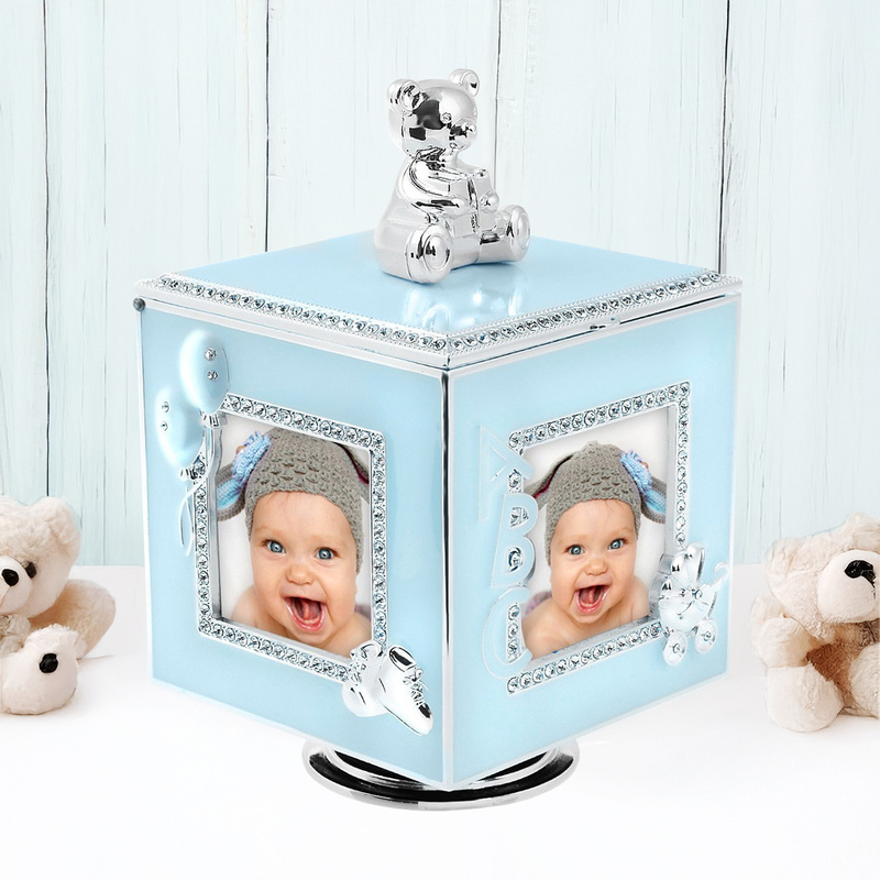 Błękitna Karuzela miś z pozytywką, szkatułką i miejscem na 4 zdjęcia na chrzest roczek