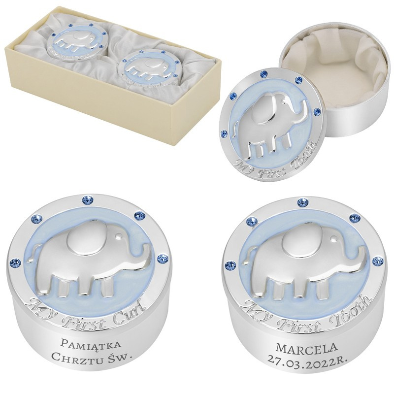 Błękitne szkatułki ze słonikiem na pierwszy ząbek i pukiel włosów / Grawer / Upominek na chrzest lub roczek.