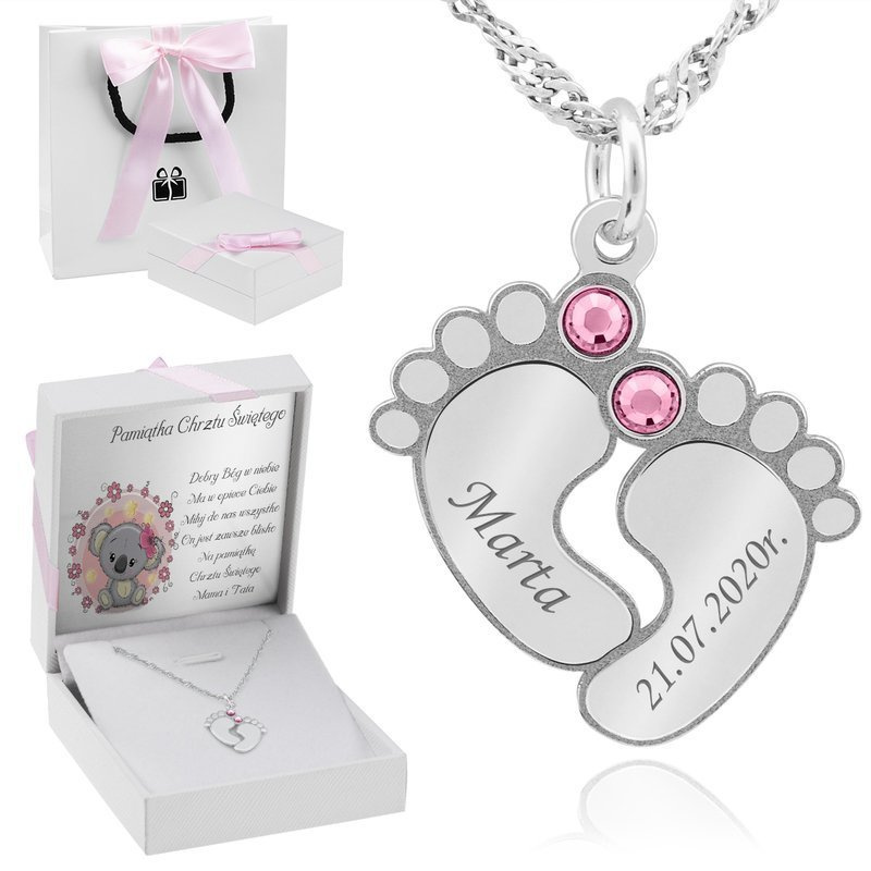 Na chrzest: wisiorek stópki 925 różowe cyrkonie z grawerem