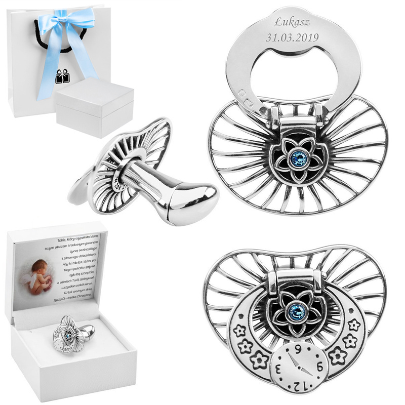 Smoczek Srebrny niebieski kamyk na Chrzest Grawer