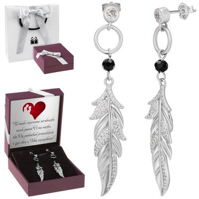 Srebrne kolczyki z piórkami i cyrkoniami / dedykacja w pudełku / pr. 925