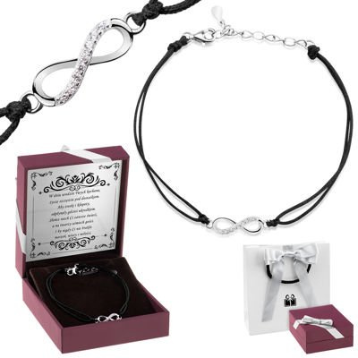 Bransoletka Nieskończoność z cyrkoniami na czarnym sznurku Srebro 925 Dedykacja