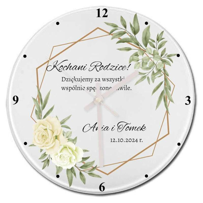 Okrągły szklany zegar z personalizacją UV - podziękowanie dla rodziców od pary młodej/ średnica 20 cm