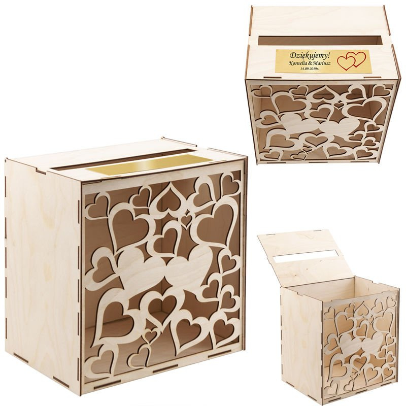 Drewniana skrzynka na koperty ślubne z sercami z Twoją Dedykacją