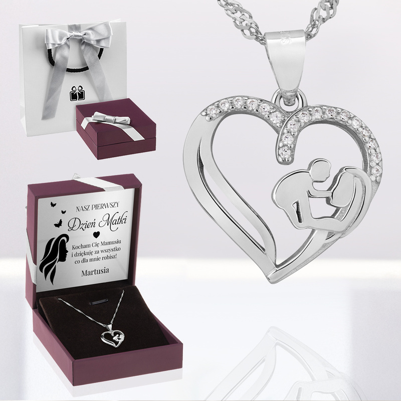 Wisiorek serce z mamą i dzieckiem + srebrny łańcuszek 45 cm | Srebro 925 | Prezent na Dzień Matki
