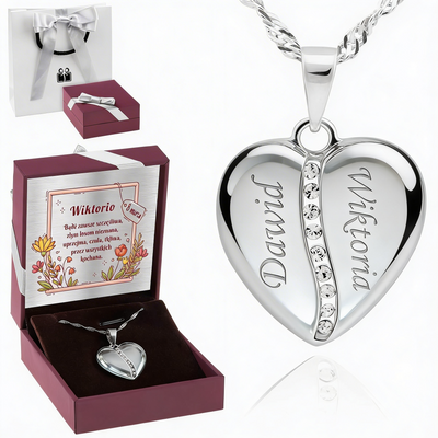 Na rocznicę: srebrny naszyjnik serce 925 z dedykacją w pudełku