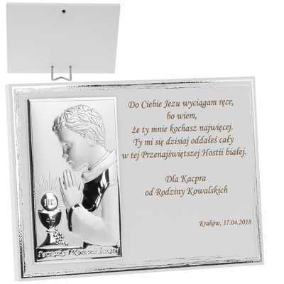 Obrazek srebrny chłopiec pamiątka na I Komunię Św. Grawer