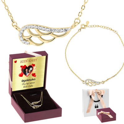 Komplet naszyjnik + bransoletka skrzydło z cyrkoniami pr. 925 Prezent z Dedykacją