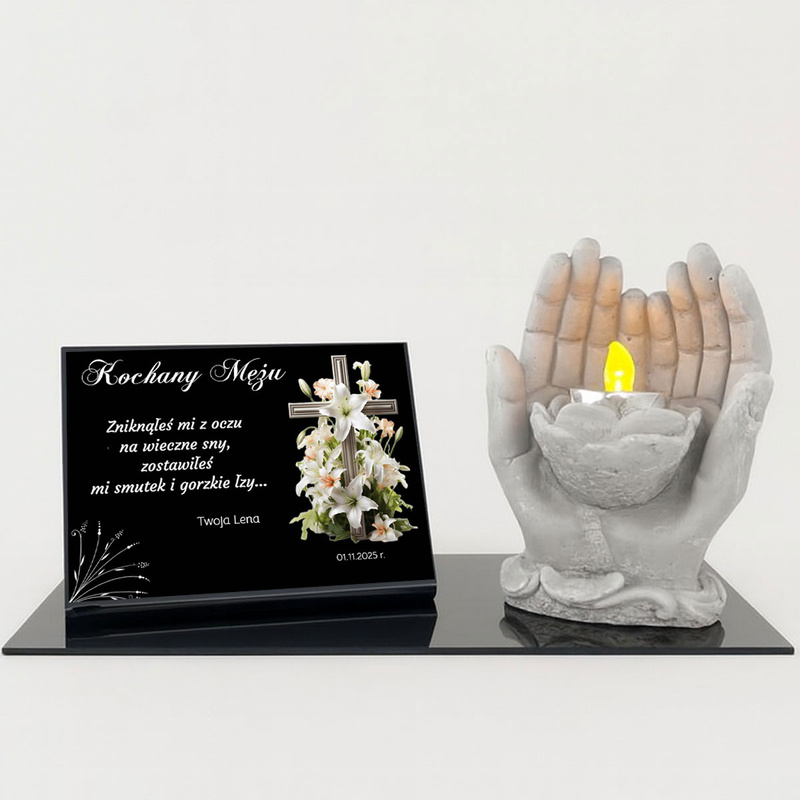 Nagrobny zestaw z czarną tabliczką UV, dłońmi i świeczką LED