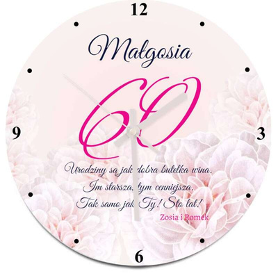 Okrągły szklany zegar na urodziny z personalizacją UV, delikatne kwiaty