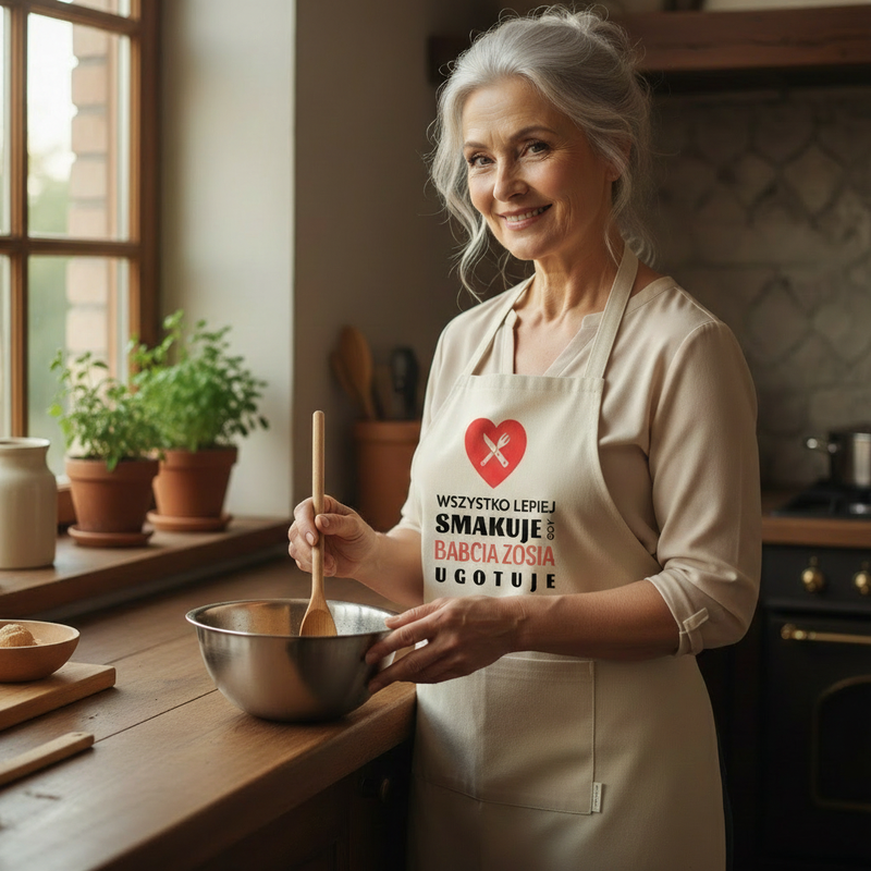 Fartuch kuchenny z nadrukiem i personalizacją „Wszystko lepiej smakuje, gdy Babcia ugotuje”