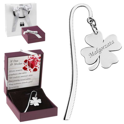 Srebrna zakładka do książki - duża koniczynka / Dedykacja i Grawer