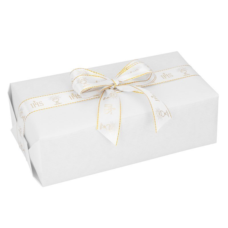 Ręczne pakowanie prezentu na Komunię Świętą biały papier