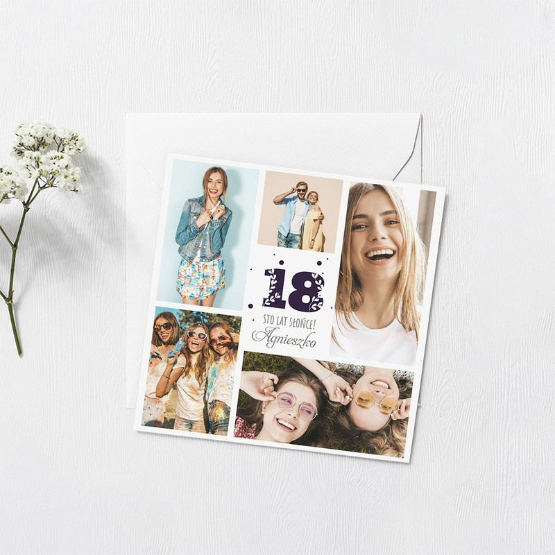 Kartka na 18 urodziny kolaż zdjęć z dedykacją i cyfrą 18