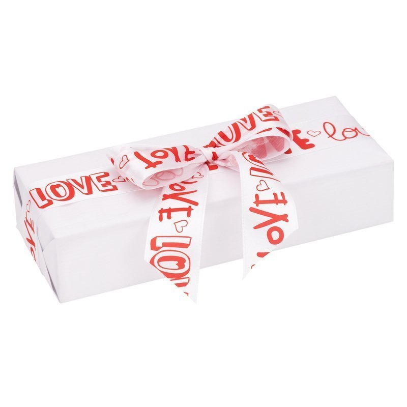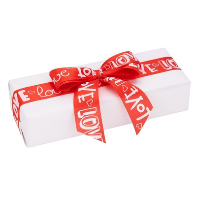 Ręczne pakowanie prezentu - czerwona wstążka, całość zapakowane w ozdobny biały/ecru papier
