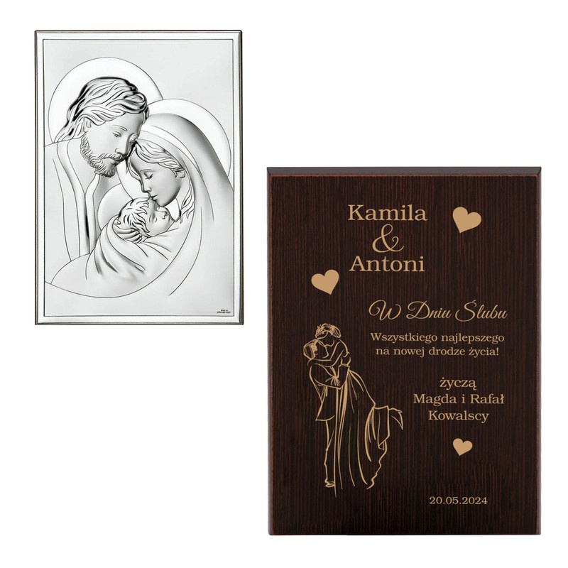 Srebrny Obrazek/ Święta Rodzina /na jasnym drewnie/ Pamiątka Ślubu /Rocznicy /Grawer/13x17 cm