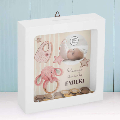 Drewniana skarbonka ze zdjęciem dziecka z Nadrukiem