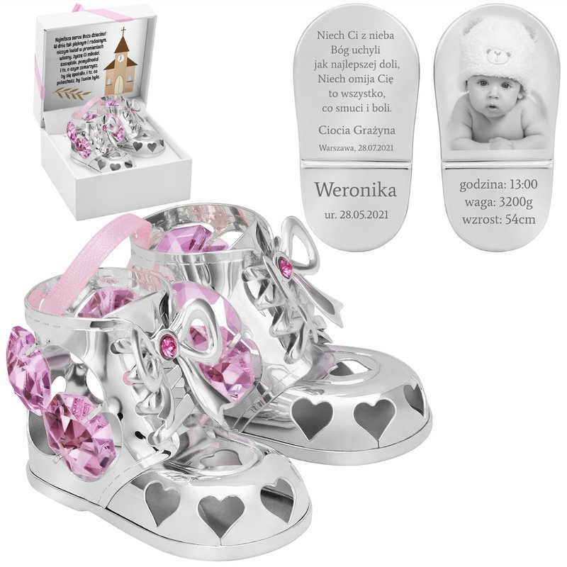 Buciki baletki różowe Chrzest Roczek kryształy GRAWER, TABLICZKA